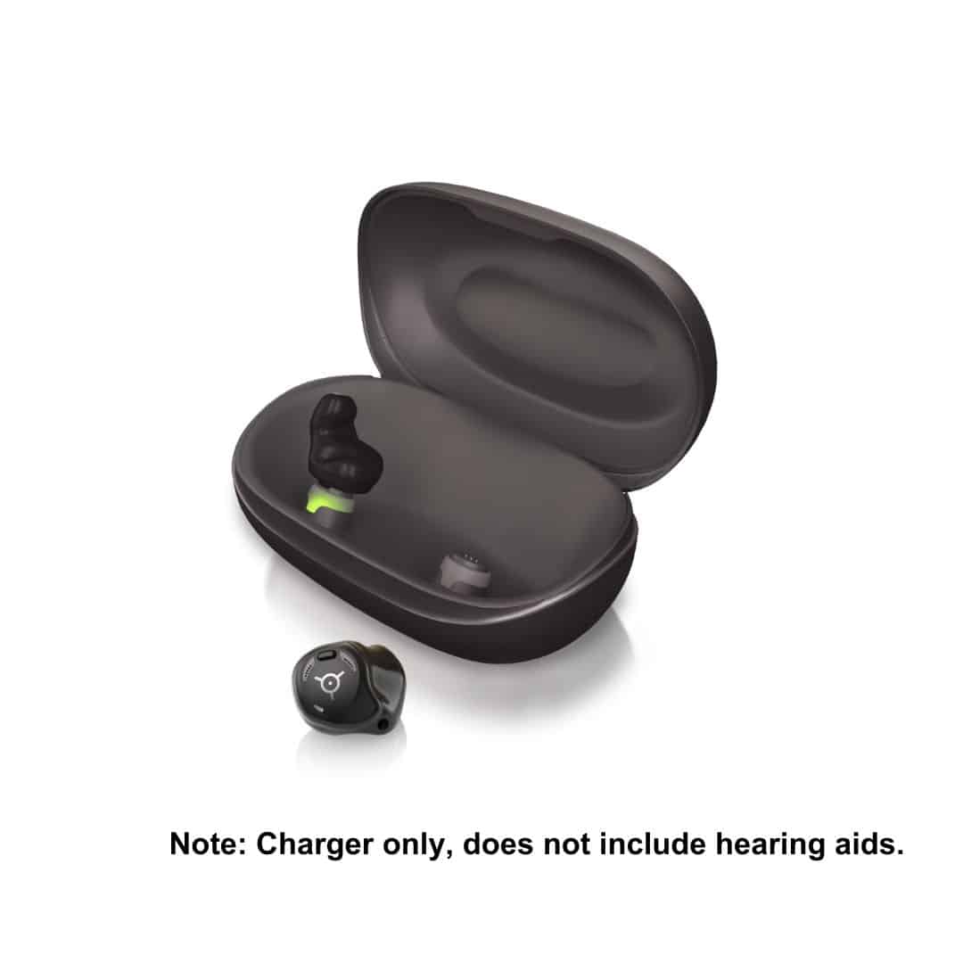 - Magnetic Snap-and-Charge Dock: Uses magnetic points to pull the hearing aids into the correct position.